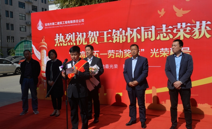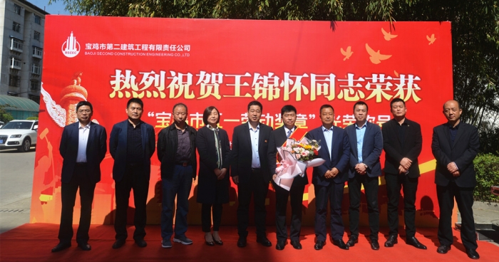 4月27日上午,寶雞市慶?!拔逡弧眹H勞動節(jié)大會在萬福酒店召開,公司第三十四項目部項目經(jīng)理王錦懷同志榮獲寶雞市“五一勞動獎章”光榮稱號。公司在總部辦公樓前舉行了歡迎儀式,公司董事長胥立、總經(jīng)理張小揚、黨委書記景旭東、黨委副書記王紅衛(wèi)、工會主席王建成等領導出席,總部全體人員、第三十四項目部員工代表參加。